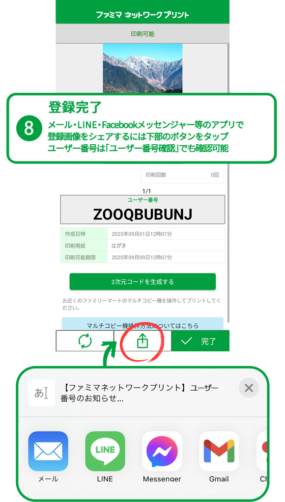 ファミマネットワークプリントアプリを起動し、ユーザー番号をタップし、印刷するユーザー番号をタップユーザー番号を選択